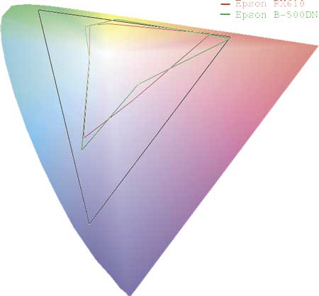 Поскольку данный принтер ориентирован на офисное использование, мы не рассматривали его как средство для профессиональной печати фотографий, поэтому меньше внимания уделяли цветовому охвату. Но справедливости ради приводим рисунок с двумя цветовыми охватами — принтера Epson B-500DN и многофункционального устройства Epson RX610 в проекции на плоскость и в сравнении с цветовым охватом AdobeRGB. Как видно из рисунка, цветовые охваты этих устройств очень схожи и не дотягивают до цветового охвата AdobeRGB.