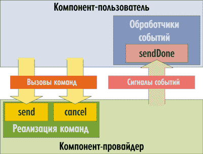 Команды являются неблокируемыми запросами к компонентам нижележащего уровня. Чтобы не возникало продолжительных задержек, время отклика вызванной команды не должно превышать заданного интервала времени, при этом команда должна вернуть флаг, указывающий, успешно она завершилась или нет. Отметим, что команды не могут подавать сигналы о событиях.