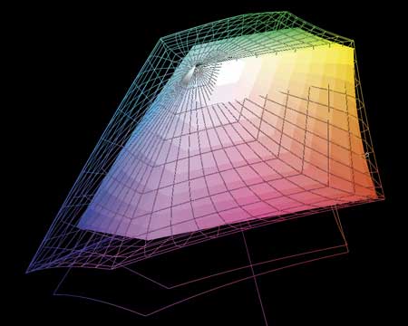 На рис. 2 профиль монитора LG FLATRON W2252TQ (сплошная поверхность) сравнивается с профилем Adobe RGB (1998) (сетка) в цветовой координатной системе L*a*b* при цветовой температуре 6500 К.