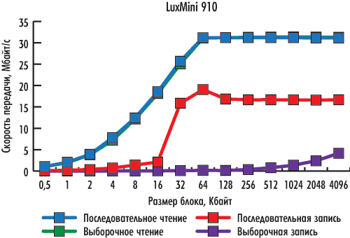 Данная модель уже во второй раз участвует в нашем тестировании. Ее модификация, ставшая победителем предыдущего тестирования, обладала объемом памяти 32 Гбайт. Данная модель практически полностью повторяет описанную выше LuxMini 910. Различие состоит в расцветке декоративных накладок: вместо металлического серебристого цвета тут используется черно-белый мозаичный рисунок. Однако помимо дизайна различия есть и в характеристиках: для LuxMini 920 заявлена работа на скорости 200x (x = 150 Кбайт/c), причем данное заявление, с учетом нашего опыта, может иметь под собой реальную основу. Модели LuxMini 910 и LuxMini 920 доступны в вариантах с объемом памяти от 1 до 32 Гбайт.
