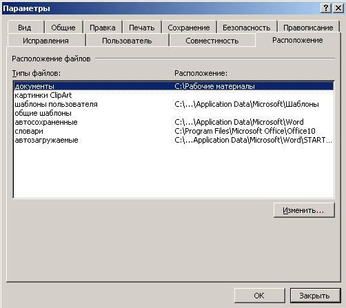 При загрузке ранее созданных файлов в Word или при их сохранении по умолчанию открывается папка Мои документы, что неудобно, если вы храните свои документы в какой-то другой папке. Чтобы изменить открываемую по умолчанию папку, воспользуйтесь командой Сервис > Параметры > Расположение, выделите в качестве типа файлов вариант Документы, щелкните по кнопке Изменить и укажите другую папку (рис. 1).