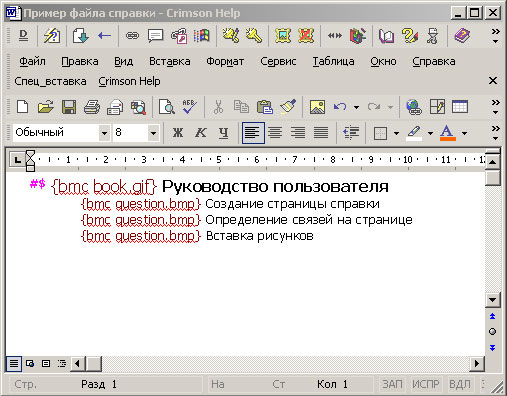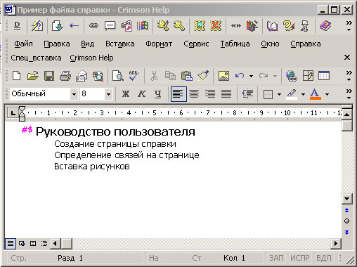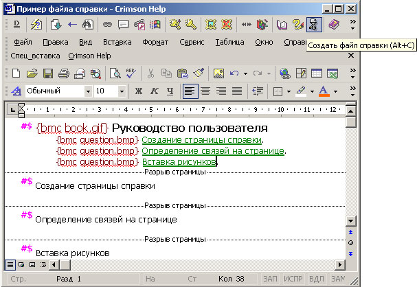 Если необходимо создать справочный hlp-файл из обычного документа Word, то это можно сделать путем подключения плагина Crimson Help для Microsoft Word 2000/XP (http://crimsoft.euro.ru/CHelp23.exe, freeware). Плагин имеет интуитивно понятный интерфейс и позволяет создавать многостраничные справочные файлы с использованием как текста, так и графики.