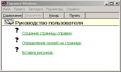 На следующем этапе установите обычные связи. Выделите на главной странице заголовок, при щелчке по которому должен осуществляться переход к первой подстранице, щелкните по кнопке Обычная связь и укажите имя первой подстраницы. Аналогичным образом сделайте ссылки на вторую и третью подстраницы. Для проверки работы создаваемой справочной системы щелкните по кнопке Создать файл справки — в итоге в папке нахождения файла проекта будет создан одноименный файл с расширением hlp (рис. 12), который и будет файлом справки. Получившийся в итоге файл справки будет похож на тот, что показан на рис. 13.