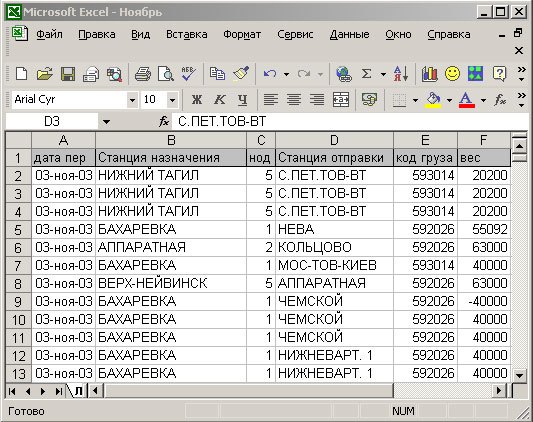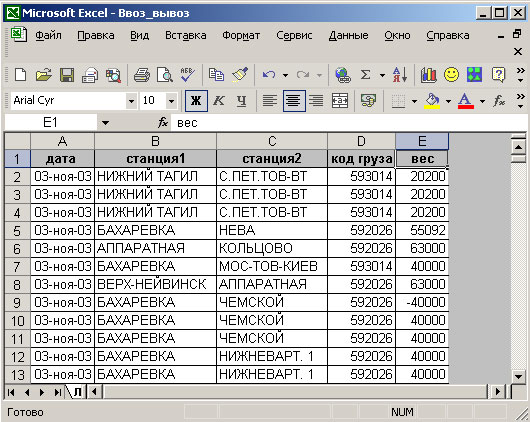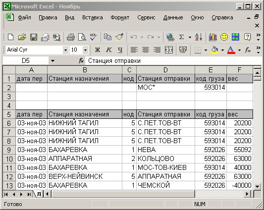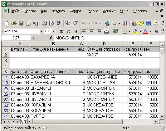 Например, пусть у нас имеется таблица ввоза-вывоза в область некоторого товара (рис. 24). Задача — оставить в таблице только те записи, где груз прибыл из Москвы (то есть в имени станции отправки фигурирует комбинация «МОС», например МОС-ТОВ-КИЕВ или МОС-ТОВ-ПАВ), и код груза — «593014».