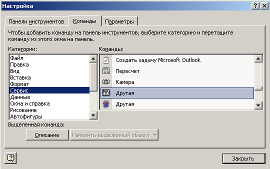 Если при работе в Excel вам постоянно требуется калькулятор Windows, то совсем необязательно для его запуска каждый раз выбирать команду Пуск > Программы > Стандартные > Калькулятор. В Excel предусмотрена возможность поместить кнопку калькулятора на панель инструментов. Для этого откройте окно Настройка с помощью команды Сервис > Настройка, перейдите на вкладку Команды и в списке Категории выберите Сервис. Затем найдите в списке команд значок калькулятора, прокрутив список команд вниз (рис. 20), и перетащите этот значок на панель инструментов. Теперь для запуска калькулятора вам будет достаточно щелкнуть по этой кнопке.
