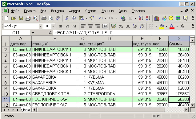 Предположим, что у вас имеется информация по продажам, перевозкам и пр., например, за месяц. Нужно найти промежуточные суммы по данным одного из столбцов за каждый день по отдельности. Для этого необходимо накапливать сумму по строкам до тех пор, пока дата остается прежней, а когда она меняется — следует переходить к вычислению новой суммы. Как правило, для решения такой задачи прибегают к созданию макроса. Но есть способ проще — воспользуйтесь функцией ЕСЛИ(лог_выражение;значение_если_истина;значение_если_ложь), указав равенство дат в качестве логического выражения. Тогда сумма должна накапливаться при истинности условия и формироваться заново в противном случае (рис. 21).