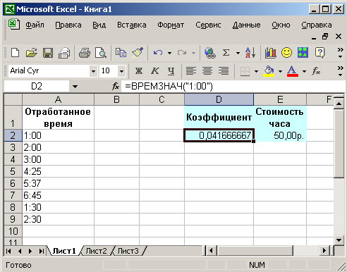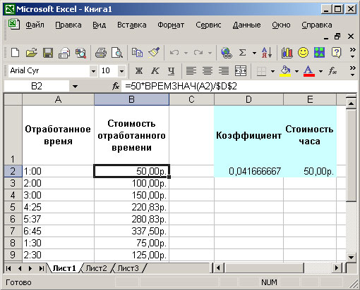 Есть более удобный выход из положения. Можно вводить время в текстовом формате, тогда внешне оно будет выглядеть привычно: «часы:минуты». Затем нужно будет перевести время в соответствующий ему числовой формат с помощью функции ВРЕМЗНАЧ(время_как_текст) и сформировать формулу вычисления стоимости отработанного времени.