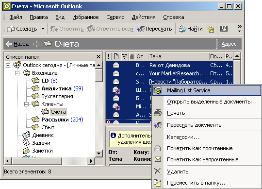 После установки MLS запустите Outlook и для выполнения операций экспорта-импорта контактов (включая списки рассылки) и адресов почтовых сообщений в дереве каталогов Outlook выберите и сделайте текущей контактную или почтовую папку. Для операций экспорта и добавления контактов из почтовых сообщений выберите в папке элементы, которые необходимо сохранить (несколько элементов одновременно можно выделить, удерживая нажатую клавишу Ctrl), а для операций импорта просто откройте нужную папку контактов. Затем запустите плагин на исполнение, вызвав из контекстного меню или из меню Сервис главной панели Outlook команду Mailing List Service (рис. 29).