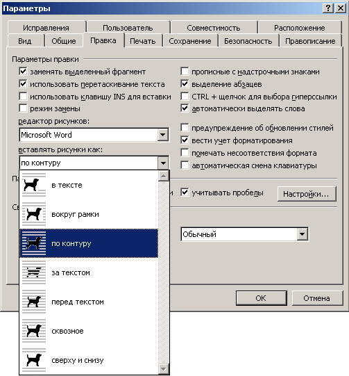 По умолчанию рисунки вставляются «в тексте», и это удобно при вставке больших изображений. Во всех остальных случаях после вставки приходится корректировать их положение, чаще всего выбирая вариант «по контуру». Если у вас именно такая ситуация, то стоит изменить вариант вставки рисунка по умолчанию. Для этого выберите команду Сервис > Параметры > Правка и в списке Вставлять рисунки как установите вариант По контуру (рис. 3).