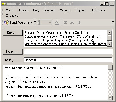 Если отправка одних и тех же писем большому количеству получателей для вас не редкость, то стоит обратить внимание на плагин Send Personally для Outlook 2000/XP/2003 (SPE — http://www.mapilab.ru/files/send_personally_rus.zip, shareware), являющийся оптимальным решением для персонифицированных почтовых рассылок. Он предоставляет альтернативный способ отправки одного сообщения многим получателям, при котором для каждого получателя создается персональное сообщение. В итоге каждый адресат не только не получает информацию обо всех остальных получателях, но даже не догадывается, что письмо было отправлено не только ему, поскольку видит в поле Кому только свое имя и адрес электронной почты.