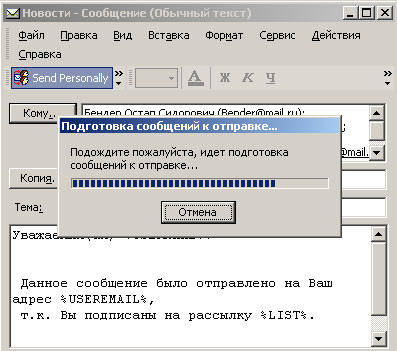 В тексте сообщения можно использовать макросы, которые при отправке письма заменяются на данные конкретного получателя: имя, электронный адрес и имя списка рассылки Outlook, в котором находился его адрес на момент отправки сообщения.