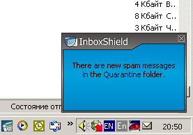 Все эти меры хороши, но требуют довольно много усилий. Намного удобнее воспользоваться специально предназначенным для этих целей плагином InboxShield для Outlook 2000/XP/2003 (http://www.edovia.com/store/1q2w3e4r/isv30en.exe, shareware), являющимся оптимальным решением для защиты от спама. InboxShield может остановить до 98% всего получаемого вами спама. Программа автоматически проверяет всю приходящую корреспонденцию на предмет отбрасывания писем в соответствии с определенными критериями. При обнаружении сообщения, относящегося по указанным критериям к спаму, она автоматически отправит его в специально предназначенную для этого папку Quarantine и уведомит вас появлением всплывающего окошка в правом нижнем углу экрана (рис. 34).