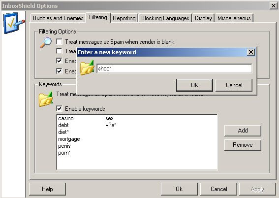 Проверка писем происходит на основе поиска в них характерных для спама слов и с учетом информации из базы данных допустимых и недопустимых адресов. Некоторый список запрещенных слов в программе установлен по умолчанию, при необходимости его можно скорректировать, добавив или удалив ключевые слова. Чтобы повысить эффективность анализа писем, можно добавлять ключевые слова в «общем» виде с использованием групповых символов «?» и «*». Для добавления запрещенного ключевого слова воспользуйтесь командой InboxShield > Options, перейдите на вкладку Filtering, щелкните по кнопке Add и введите ключевое слово в «явном» или «общем» виде (рис. 35).