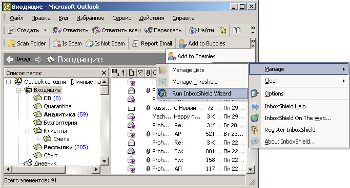 Базы адресов заполняются автоматически сразу после запуска Outlook на основе анализа как новых, так и пришедших ранее писем. При желании можно запустить данный процесс и вручную — для этого воспользуйтесь командой InboxShield > Manage > Run InboxShield Wizard (рис. 36).