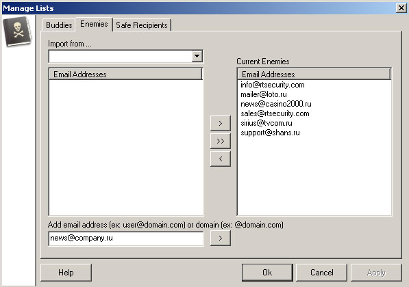 Кроме того, в системе предусмотрена возможность пополнения баз данных допустимых и недопустимых адресов напрямую — или вводя их с клавиатуры, или путем импортирования. Для этого щелкните по кнопке Manage Lists, перейдите на вкладку Buddies в случае добавления разрешенного адреса или на вкладку Enemies при добавлении запрещенного адреса и добавьте адреса в поле Add email address (рис. 38).