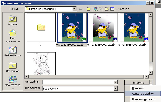 Все прекрасно знают, что для вставки в документ рисунка из файла достаточно выбрать команду Вставка > Рисунок > Из файла и указать имя файла. Но в таком случае рисунки будут внедрены в документ, в результате чего созданный файл будет иметь достаточно большой размер. Можно уменьшить размер файла путем связывания рисунка. Для этого в диалоговом окне Добавление рисунка, которое вызывается той же командой Вставка > Рисунок > Из файла, выбрав рисунок, щелкните по стрелке, расположенной справа от кнопки Вставить, а затем примените команду Связать с файлом (рис. 4).