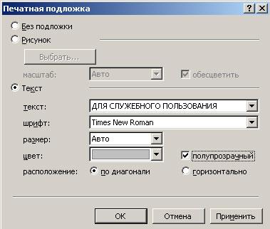 Бывает, что внедрение подложки делает текст документа неразборчивым. Если в качестве подложки выбран рисунок, проверьте, установлен ли в диалоговом окне Печатная подложка флажок Обесцветить. В случае использования в качестве подложки текста установите флажок Полупрозрачный (рис. 6) или в списке Цвет выберите более светлый цвет, например светло-серый.