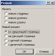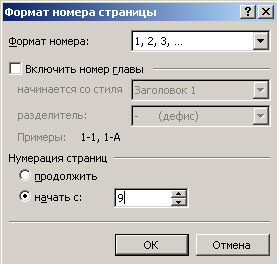 В такой ситуации в местах разрыва номеров страниц создайте новые разделы, начинающиеся с новой страницы, применив команду ВставкаaРазрыв и включив флажок Новый раздел со следующей страницы (рис. 7). После этого установите нумерацию отдельно для каждого раздела с помощью команды ВставкаaНомера страниц, каждый раз щелкая на кнопке Формат и указывая номер страницы, с которой необходимо начать нумерацию (рис. 8).